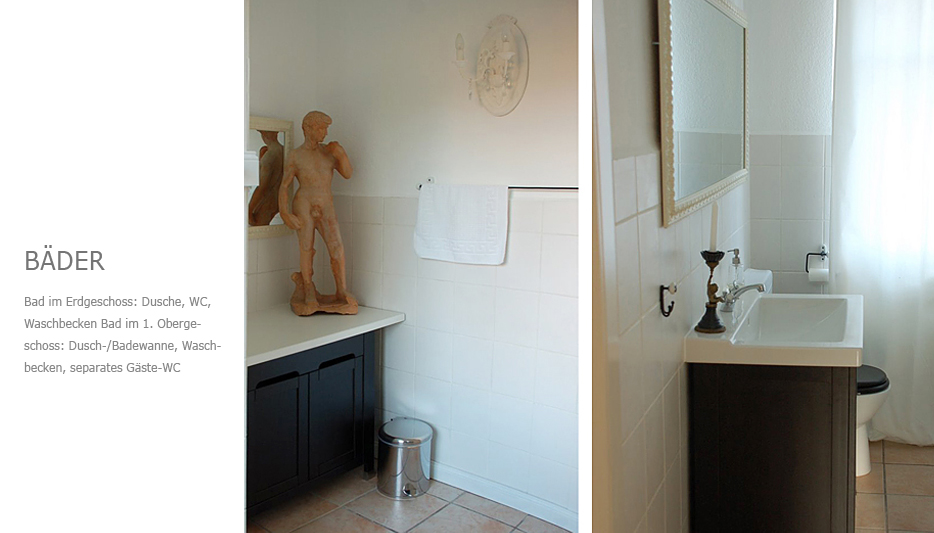 Bad im Erdgeschoss: Dusche, WC, Waschbecken Bad im 1. Obergeschoss: Dusch-/Badewanne, Waschbecken, separates Gäste-WC |