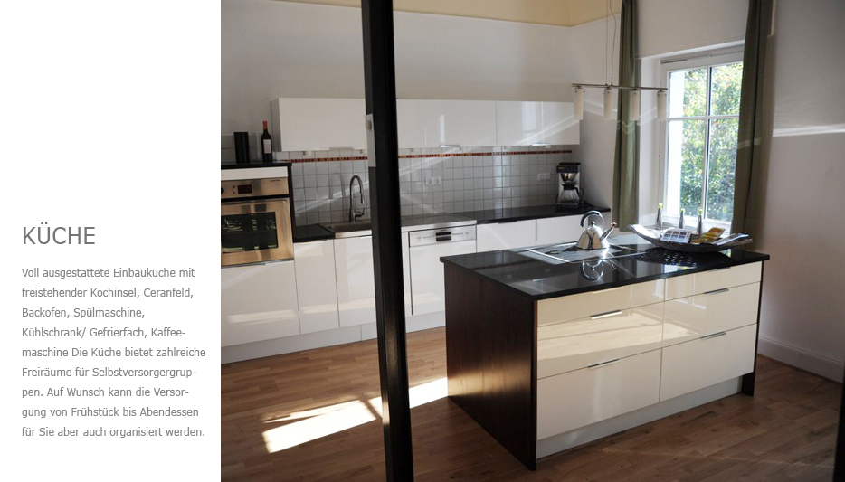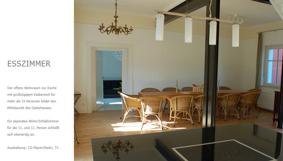 Der offene Wohnraum zur Küche mit großzügigem Essbereich für mehr als 15 Personen bildet den Mittelpunkt des Gästehauses. Ein separates Wohn-/Schlafzimmer für die 11. und 12. Person schließt sich ebenerdig an. Ausstattung: CD-Player/Radio, TV |
