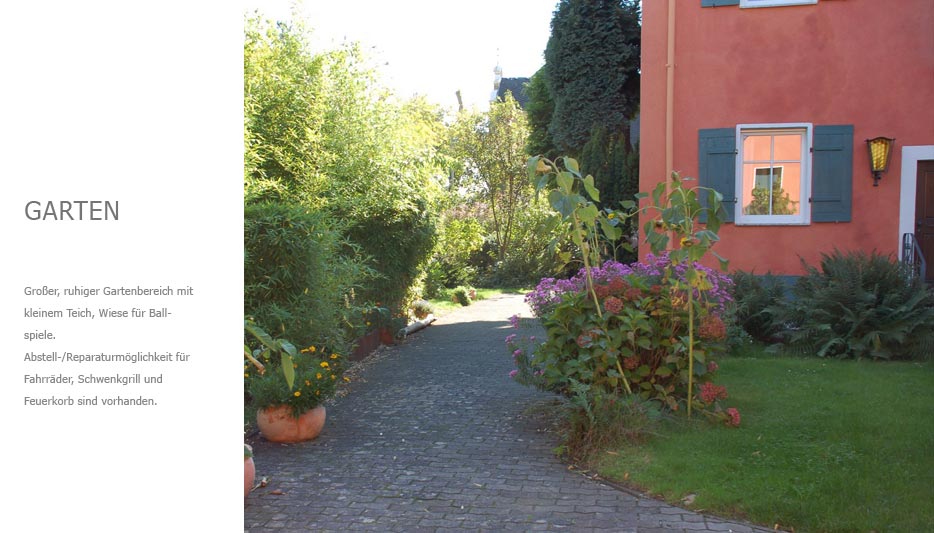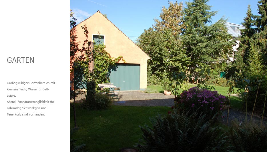 Großer, ruhiger Gartenbereich mit kleinem Teich, Wiese für Ballspiele und Teamübungen Abstell-/Reparaturmöglichkeit für Fahrräder |