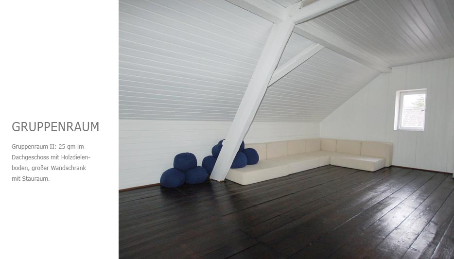 Gruppenraum II: 25 qm im Dachgeschoss mit Holzdielenboden, großer Wandschrank mit Stauraum. Bei Bedarf kann ein Seminarraum im WILLY-BRAND-FORUM, Unkel genutzt werden. Klassische Medienausstattung (Pinnwände, Flip Chart, Moderationsbedarf) ist vorhanden, Multimedia-Ausstattung auf Anfrage. |